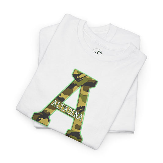 Altadena “A” Camouflage T-Shirt – Green & Gold Outline with Embedded City Name
